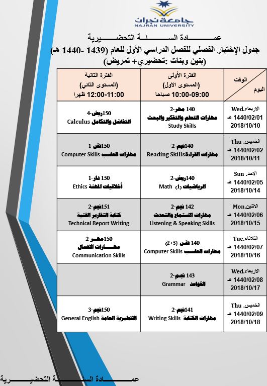 null جدول الاختبار الفصلي الأول