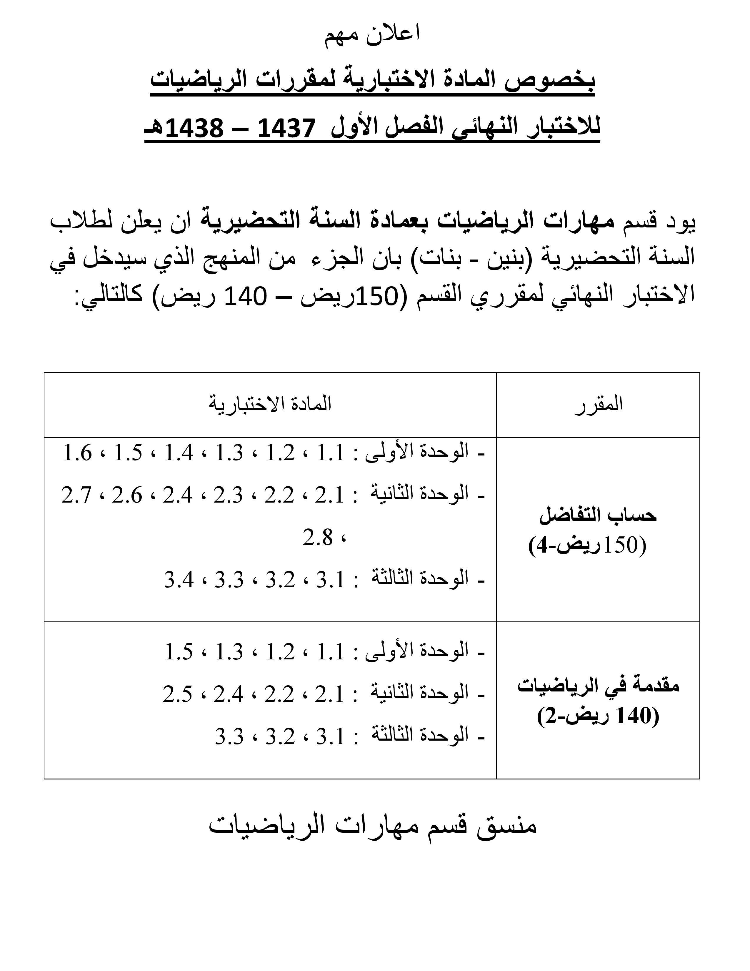 إعلان هام بخصوص المحتوى المستهدف في الإختبار النهائي لمقررات الرياضيات للفصل الدراسي الأول للعام الجامعي 1437/1438هـ