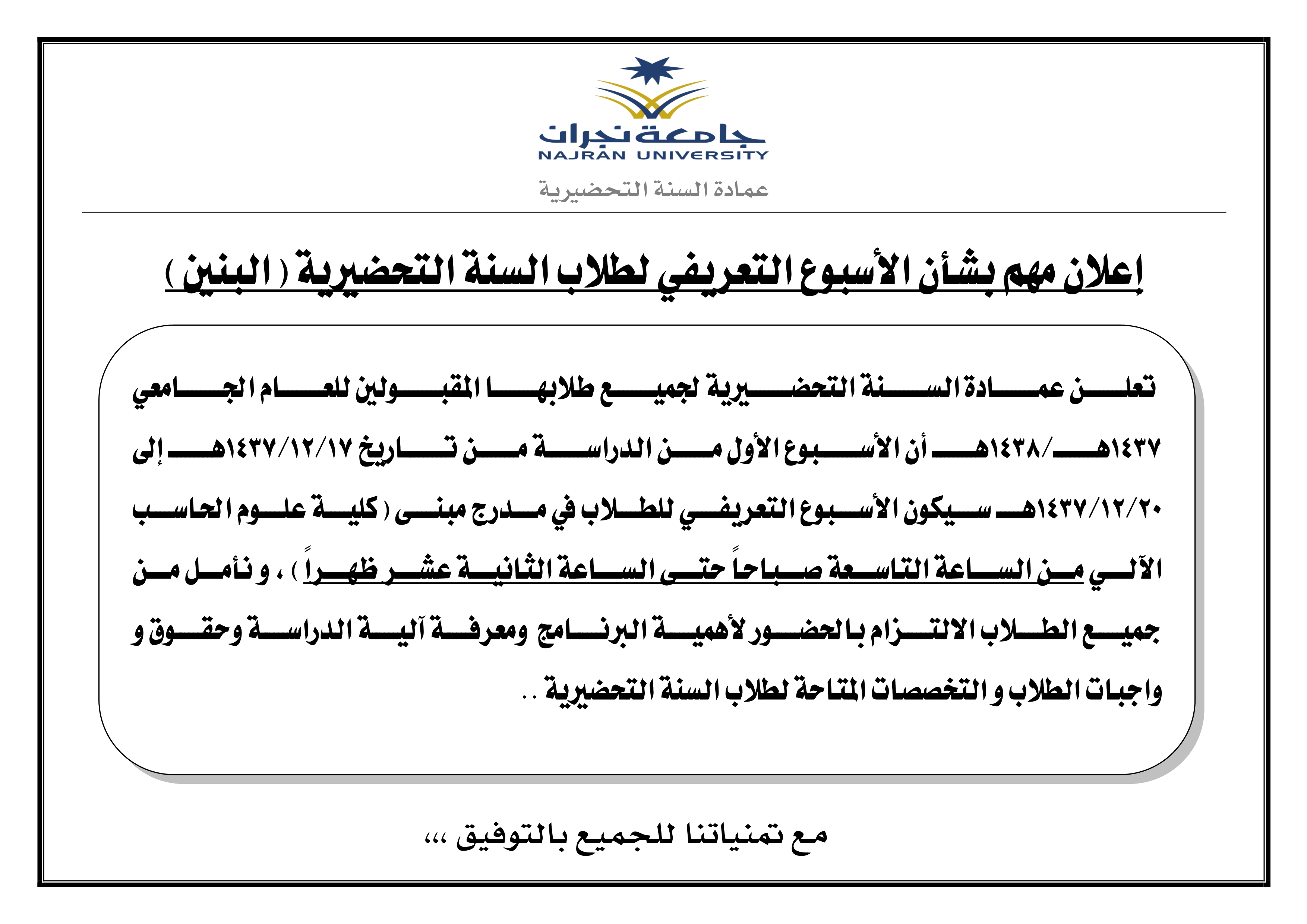 null إعلان مهم بشأن الأسبوع التعريفي لطلاب السنة التحضيرية (البنين)