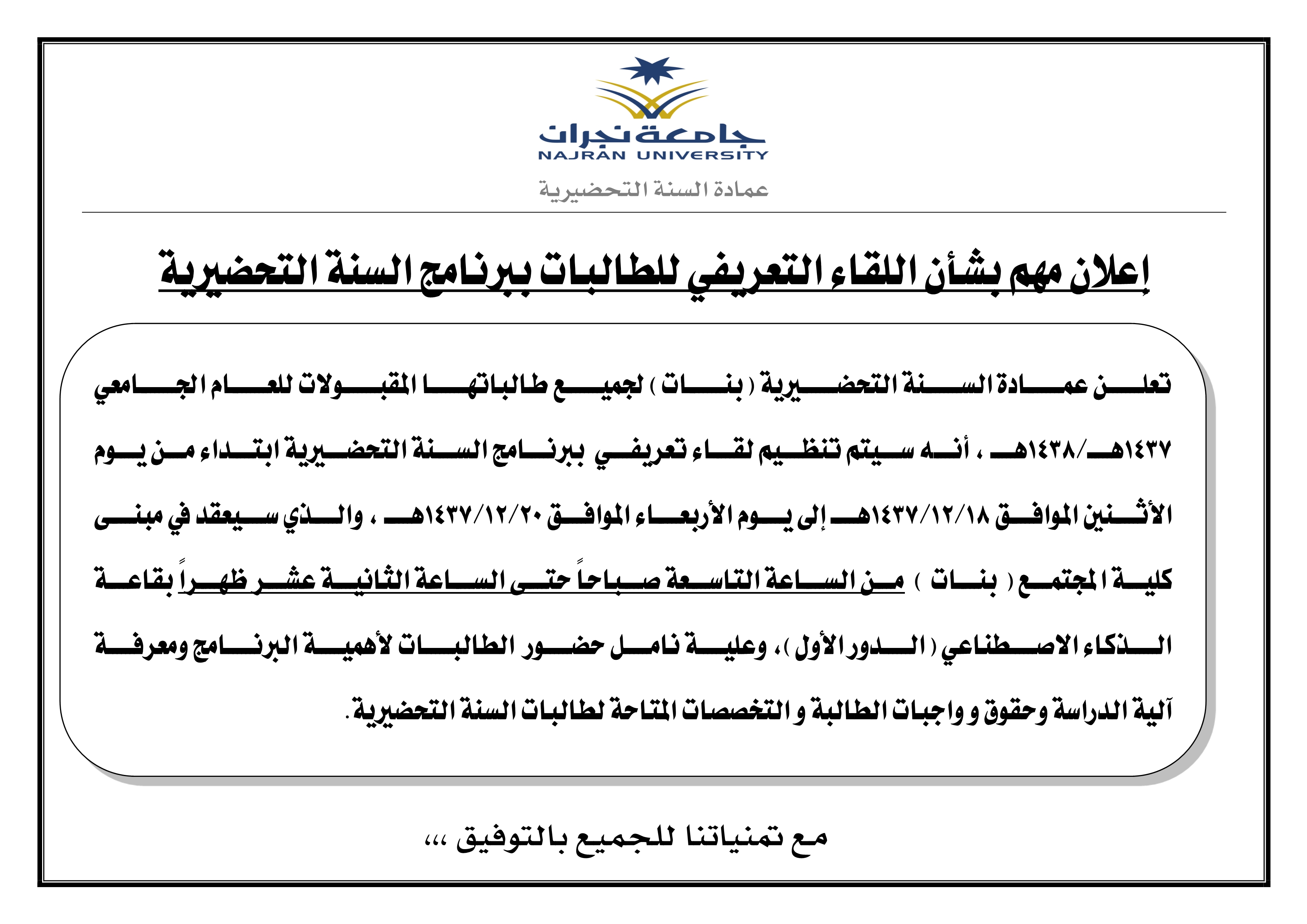 إعلان مهم بشأن اللقاء التعريفي للطالبات ببرنامج السنة التحضيرية