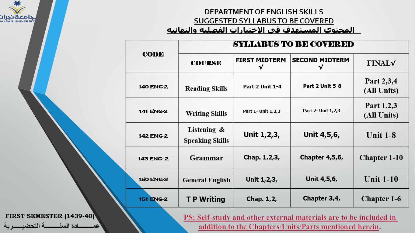 null المحتوى المستهدف في الاختبارات الفصلية و النهائية لمقررات قسم اللغة الانجليزية