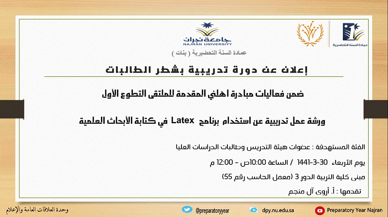 null ورشة عمل تدريبية عن استخدام برنامج Latex في كتابة الأبحاث العلمية بشطر الطالبات